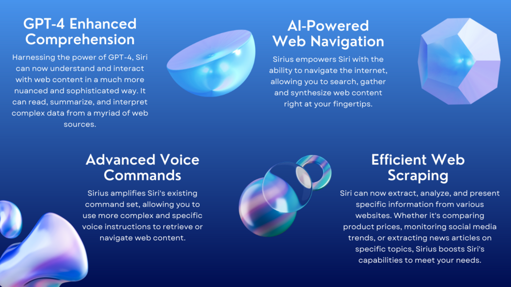 Beyond basic browsing, Sirius adds a layer of depth to Siri's capabilities. This isn't your regular AI; Sirius lets Siri comprehend, summarize, and engage with web content in a more nuanced, human-like manner, all thanks to the exceptional capabilities of GPT-4.